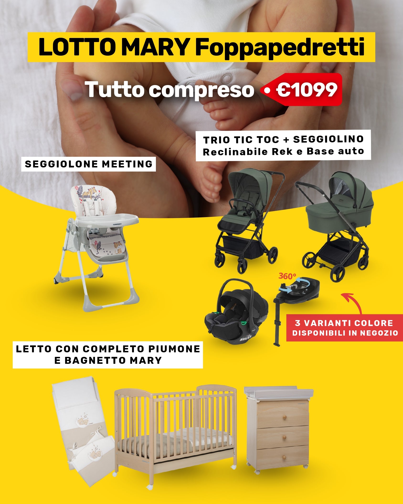 Scopri questa imperdibile Offerta, a soli 1'099 EURO , seggiolone meeting + Trio tic Toc + seggiolino Recline Rek con Base auto +letto con piumone Bagnetto Mary!!
