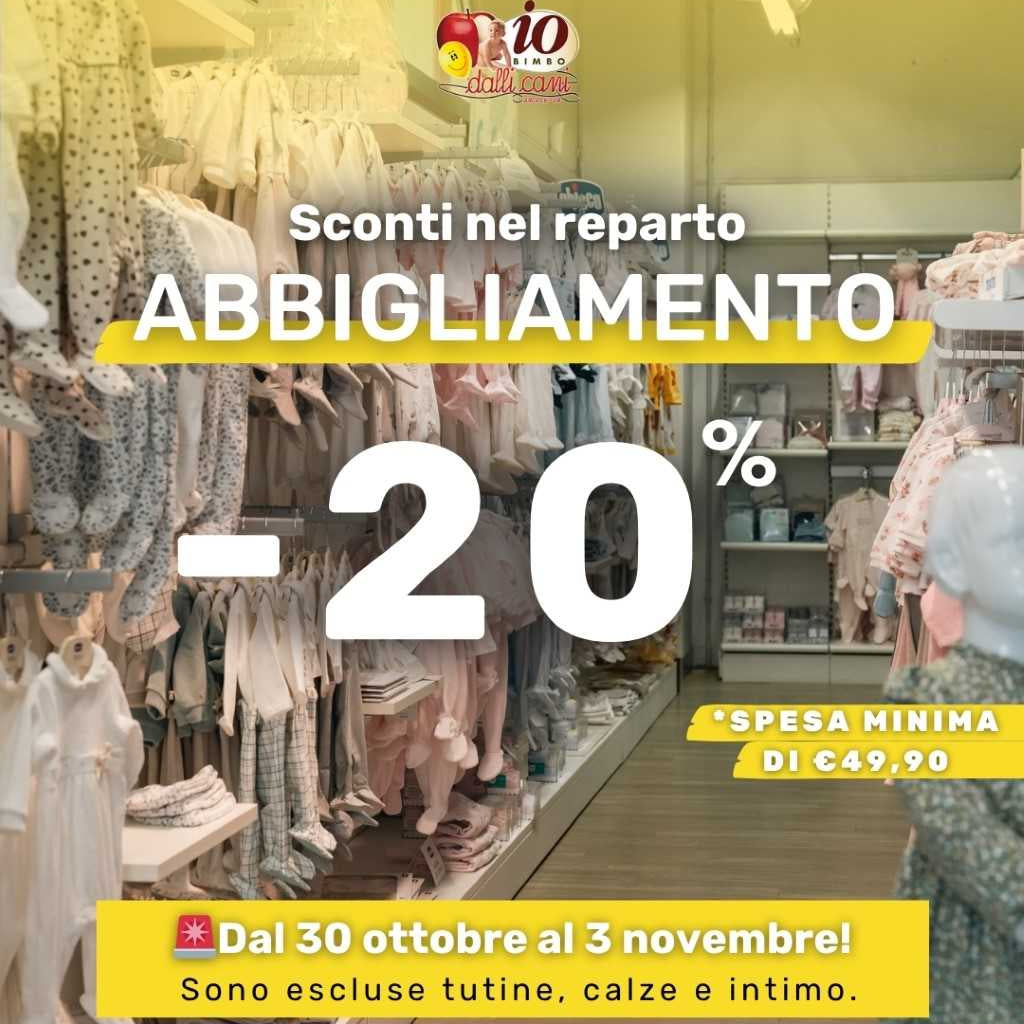 Approfitta della super promo! Con una spesa di minimo €49.90 nel reparto abbigliamento, avrai diritto ad uno sconto del 20%. Vi aspettiamo!