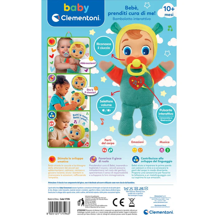 Il bambolotto interattivo “Prenditi cura di me” di Clementoni è studiato per accompagnare i piccoli nelle prime esperienze di gioco affettivo. Premendo il pulsante sul pancino e utilizzando il ciuccio sensore, il bambino attiva due modalità diverse: una dedicata all’apprendimento delle parti del corpo e una focalizzata sugli stati d’animo come felicità, tristezza e sonno. Il gioco aiuta a sviluppare linguaggio, percezione visivo-uditiva e relazione causa-effetto, stimolando il classico gioco di ruolo che tanto piace alla prima infanzia. È un prodotto progettato per essere intuitivo, educativo e coinvolgente, ideale anche per prepararsi all’arrivo di un fratellino o una sorellina.