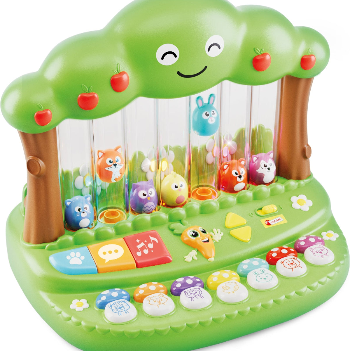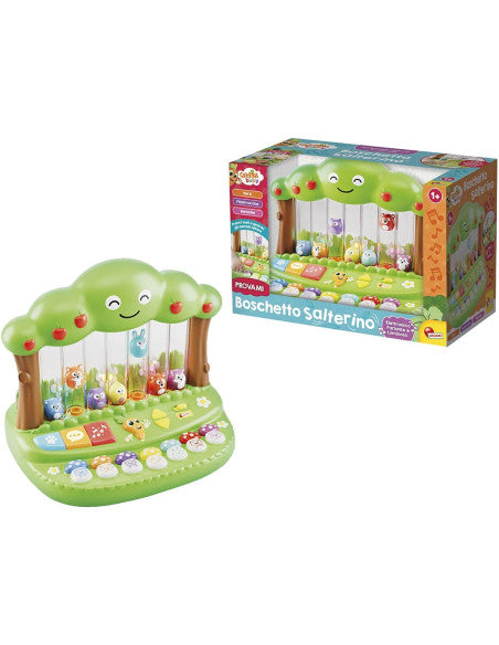 Questo colorato bosco elettronico e luminoso, è popolato da tanti animali. Basta premere i funghetti per ascoltare versi, filastrocche e allegre musichette! Il divertimento non finisce mai, perché gli animaletti sono così felici che saltano su e giù!
