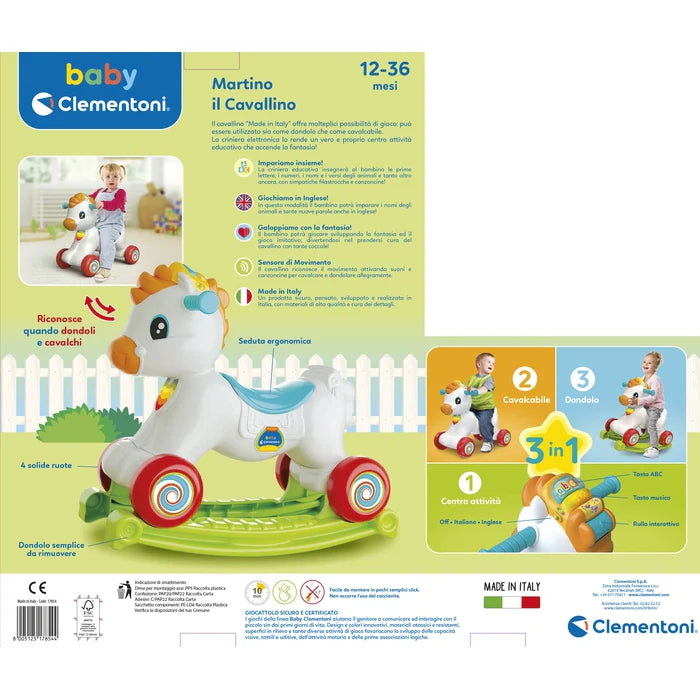 Martino il Cavallino è il simpatico compagno di giochi firmato Clementoni che accompagna il bambino alla scoperta del movimento e dell’apprendimento!