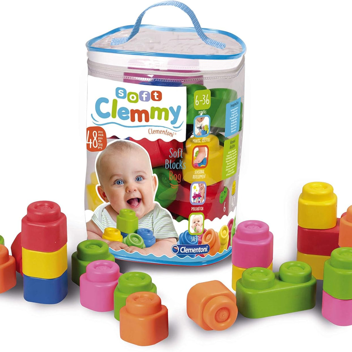 Una simpatica sacca trasparente piena di 40 mattoncini Soft Clemmy, pensati per accompagnare il bambino nella prima esplorazione del mondo delle costruzioni. Realizzati in materiale morbidissimo e lavabile, sono facili da afferrare e impilare, ideali per piccoli manini curiosi.