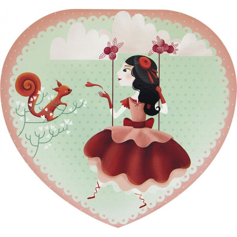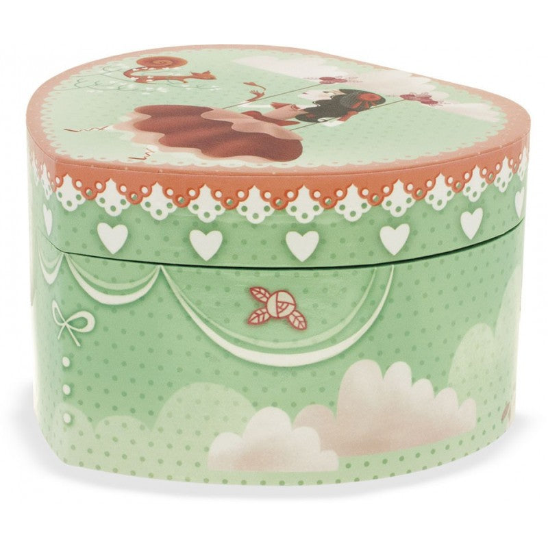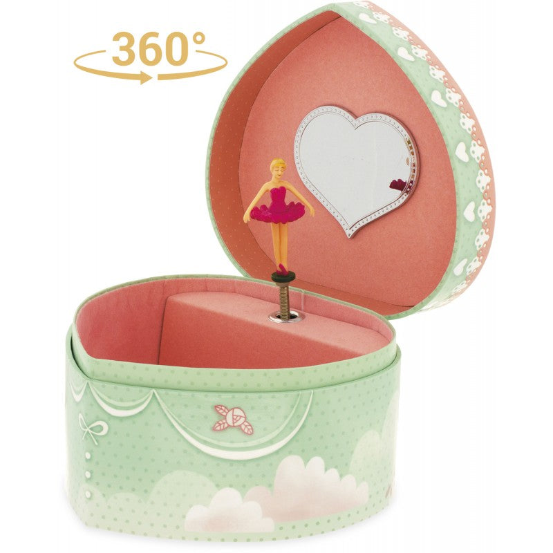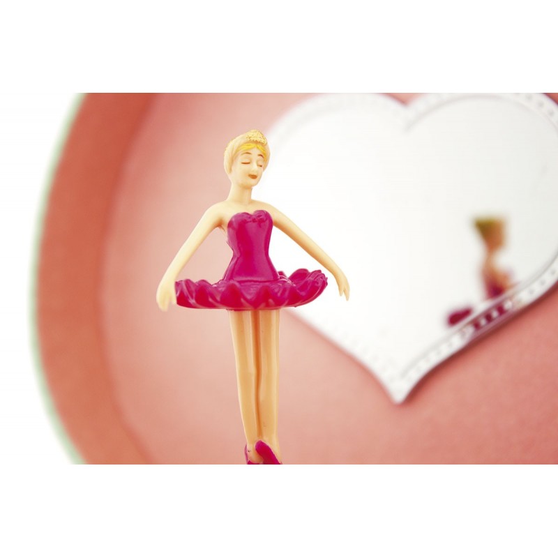 Quando si apre il portagioie, una piccola ballerina inizia a volteggiare al suono di una musica delicata. La chiave del meccanismo del carillon si trova sul retro della scatola.