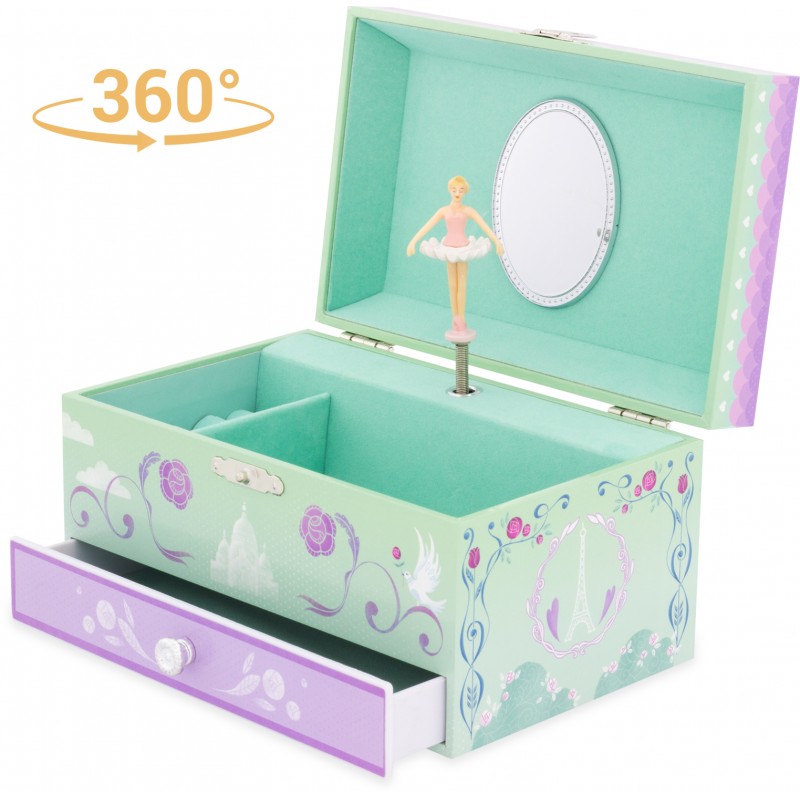 Quando si apre il portagioie, una piccola ballerina inizia a volteggiare al suono di una musica delicata. La chiave del meccanismo del carillon si trova sul retro della scatola.