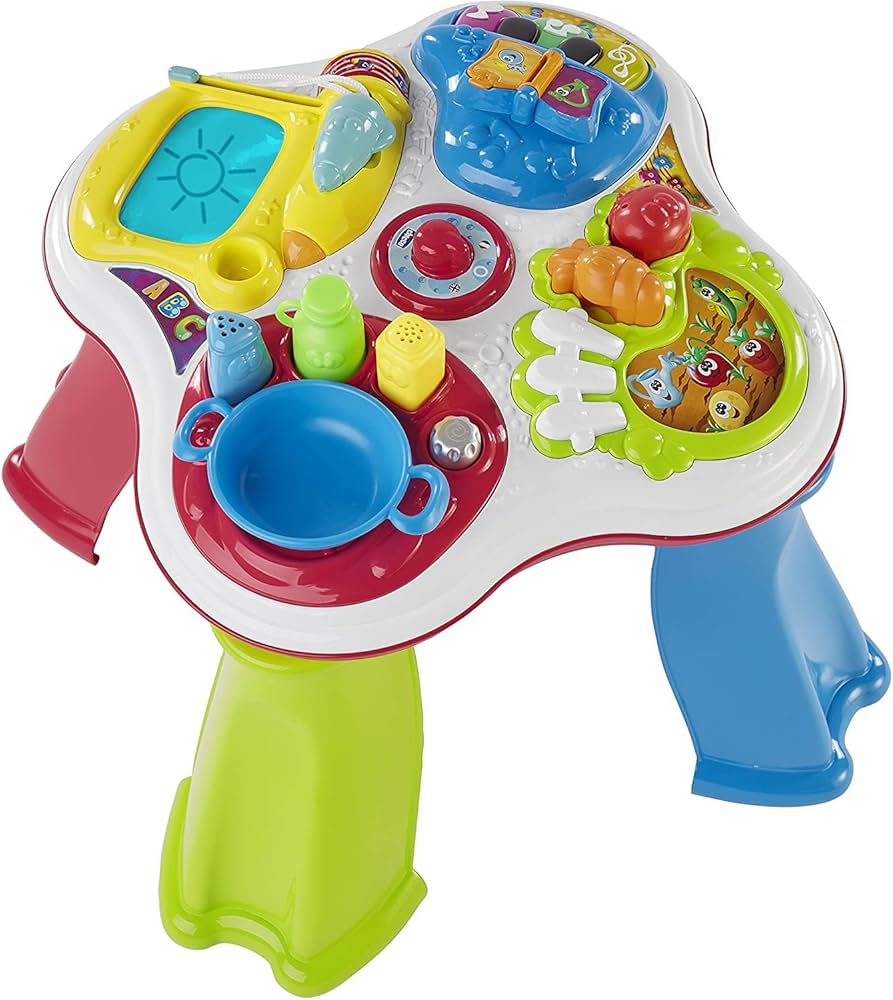 Il Tavolo Cresci e Impara è un tavolo attività bilingue (italiano / inglese) pensato per bambini dai circa 1 fino a 4 anni. Offre più di 60 parole, frasi, canzoni e suoni in due lingue, distribuiti in quattro aree tematiche: cucina, giardinaggio, musica e arte. Include una lavagna magica per disegnare e cancellare all’infinito, strumenti musicali per apprendere suoni e note, formine removibili per stimolare il gioco di ruolo e l’apprendimento delle verdure, e una modalità elettronica che guida passo-passo il bambino. Le gambe sono rimovibili per consentire anche il gioco da seduti o da tavolo. Questo prodotto favorisce lo sviluppo del linguaggio, della creatività, della coordinazione e dell’indipendenza nel bambino.