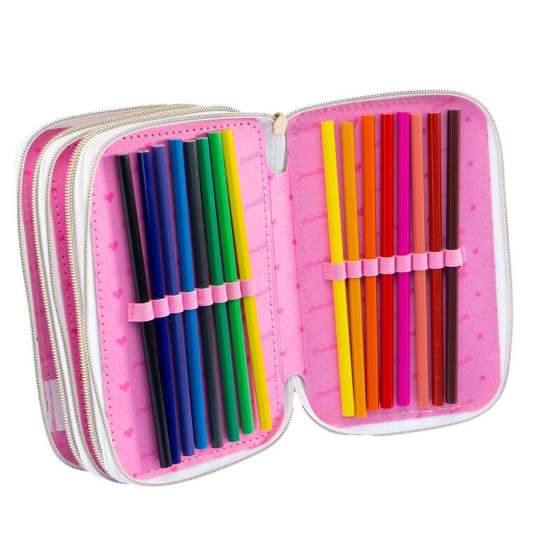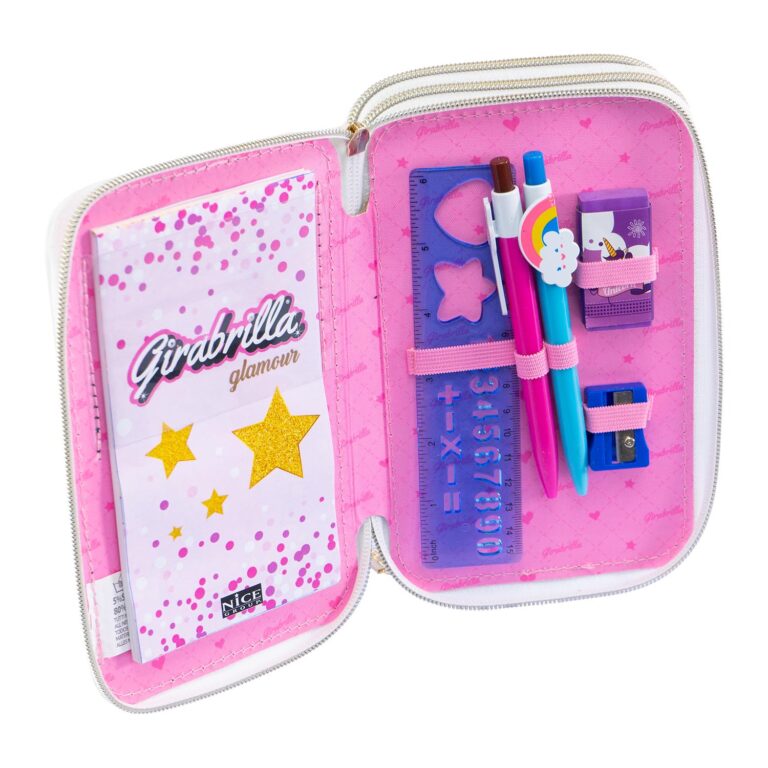 CONTENUTO: 1 astuccio, 1 notebook (A6), 1 ,righello, 2 penne a sfera a scatto, 1 temperino, 1 gomma colorata, 16 matite pastello colorate, 16 pennarelli punta fine colorati.
