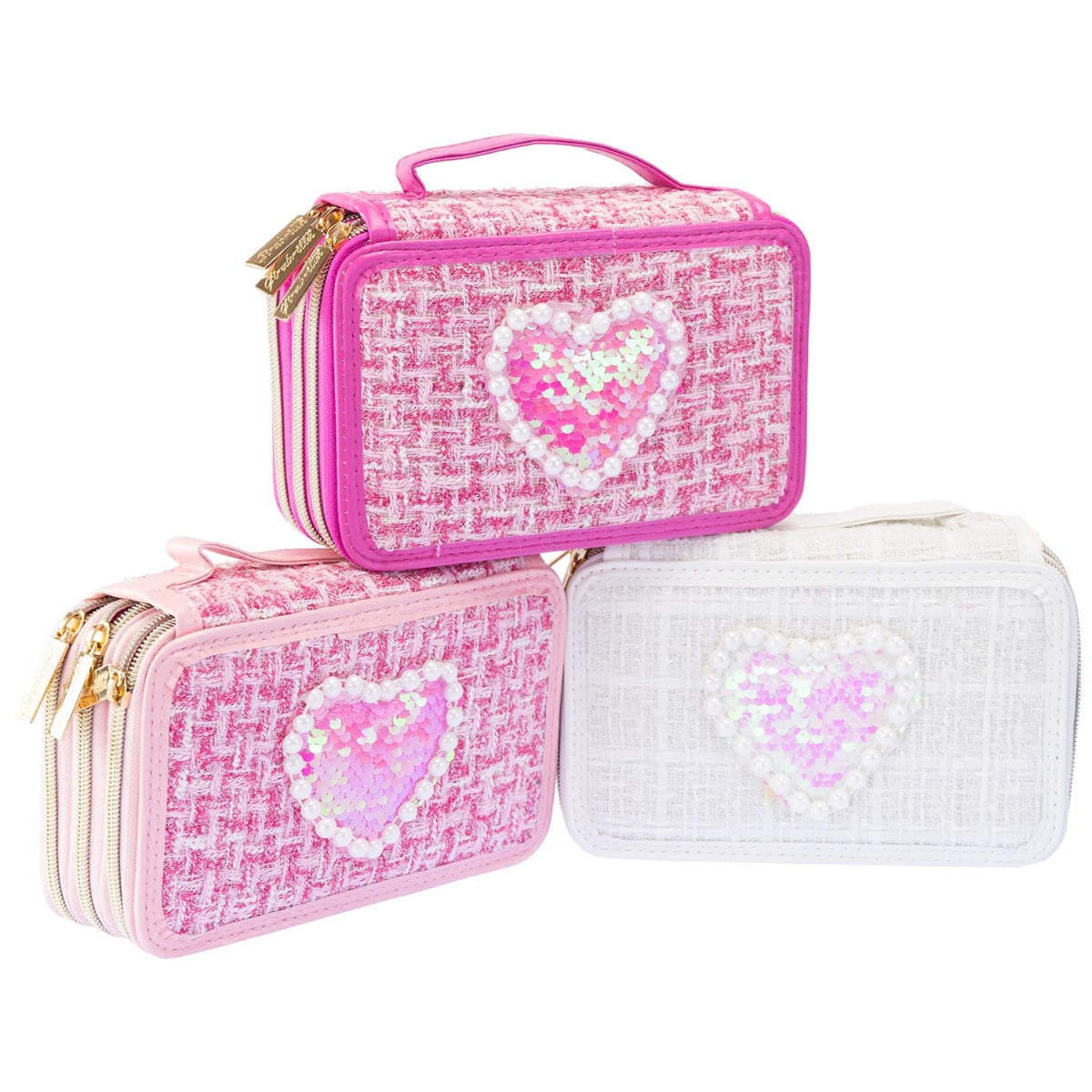 Grazioso astuccio in tela tweed con tre scomparti chiusi con una zip dorata. Rifinito con paillettes reversibili e perle. E’ corredato di tutto il materiale di cancelleria.