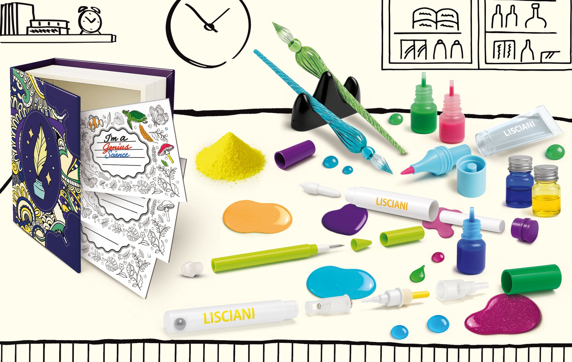 Un kit completo pensato per far scoprire quanto può essere divertente creare strumenti di scrittura personalizzati e sperimentare con inchiostri e pigmenti. All’interno due eleganti penne a immersione con il poggia penne, pronte per essere usate con inchiostri colorati e brillanti. Si possono realizzare penne cancellabili e evidenziatori “fai da te”, una penna a sfera e inchiostri colorati, glitter e profumati.