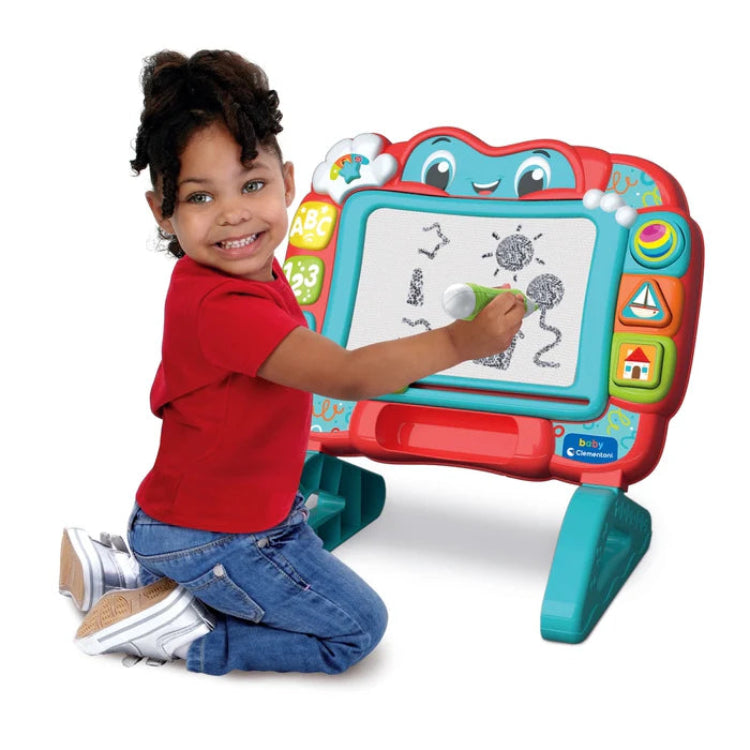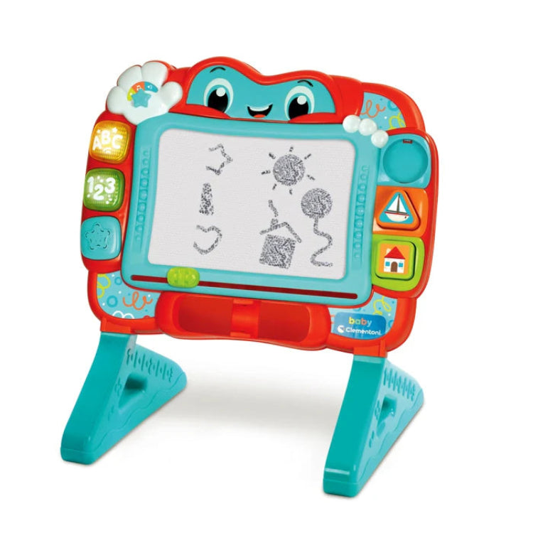 La divertente e coloratissima lavagna interattiva, lei stessa il personaggio, con cui giocare, imparare le prime lettere e i primi numeri e disegnare con gli stampini o con la matita.