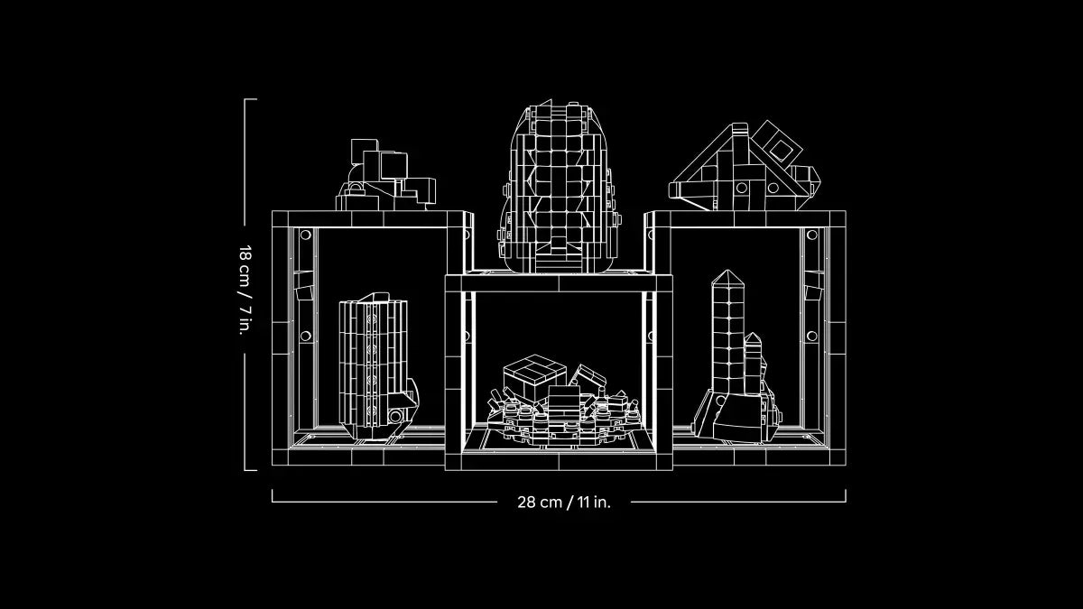 - Dimensioni: questo modello da collezione LEGO® di 880 pezzi build-and-display misura 18 cm di altezza, 28 cm di larghezza e 7 cm di profondità con tutti gli scaffali posizionati insieme
