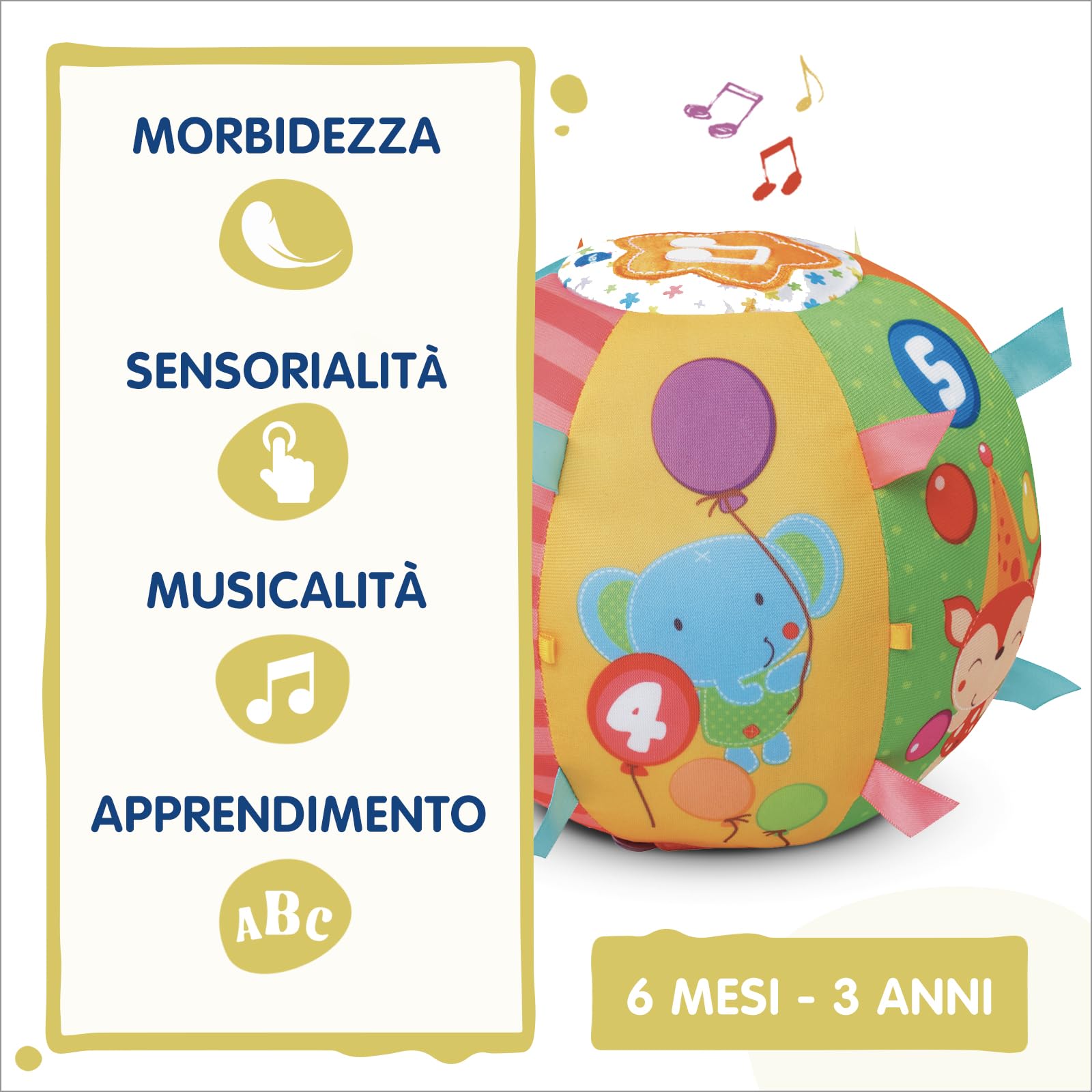Un grande pulsante arancione a forma di stella sulla parte superiore della palla per ascoltare canzoni, melodie e conoscere gli animali e i primi numeri.