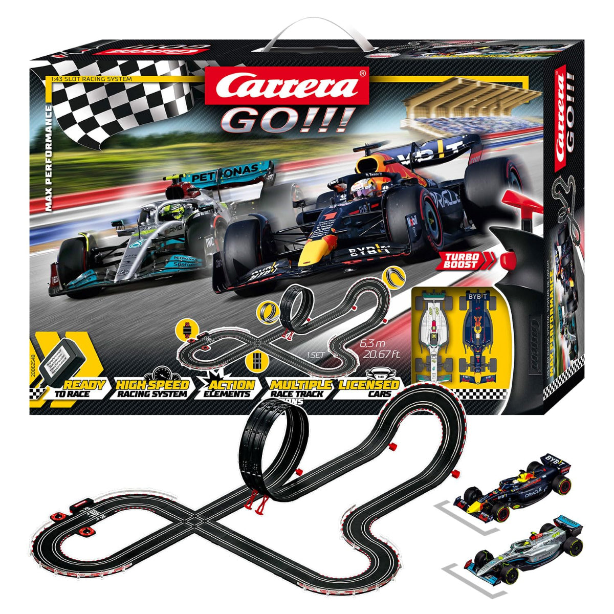 Rivincita del Campionato del Mondo di Formula 1: Mercedes vs Red Bull Racing. Il duello dei candidati al Campionato del Mondo di F1 del 2021 è disponibile anche in piccolo formato: la Carrera GO!!! Set ''Max Performance'' consente a te e ai tuoi amici di rivivere gli emozionanti duelli di Formula 1 tra Max Verstappen e Lewis Hamilton in qualsiasi momento. Divertente duello per il Campionato del Mondo Alimentato da due controller manuali con pulsante turbo, il jet F1 Mercedes 2022 ''Hamilton, No.44'' e il F1 Red Bull 2022 ''Verstappen, No.33'' jet alla massima velocità su lunghi rettilinei e curve. È necessaria una precisione speciale sul controller manuale durante il controllo mediante sorvolo, looping e all'incrocio. Fino a 2 giocatori: Scala 1:43