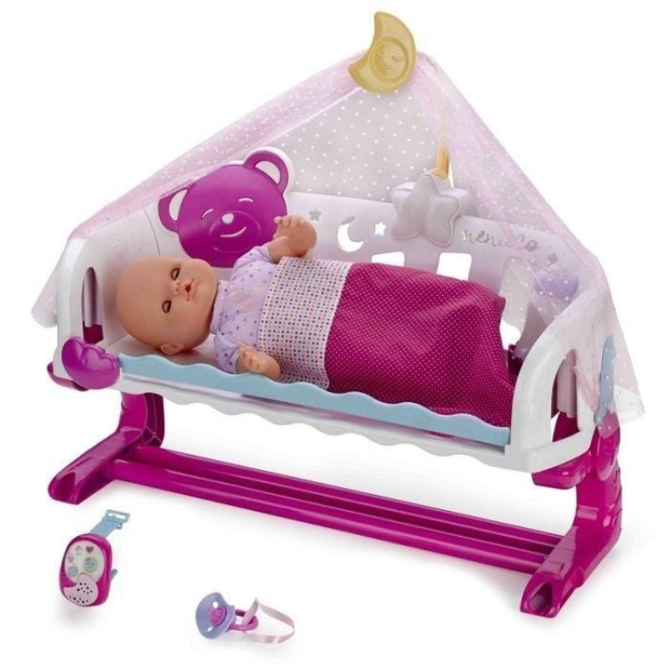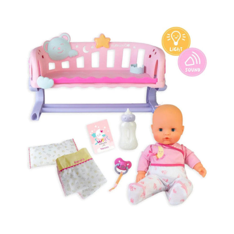 Accessori inclusi: ciuccio, biberon, copertina e stella luminosa con effetti sonori per arricchire il gioco.