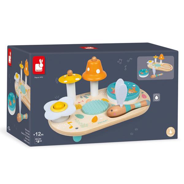 Benvenuti nella natura, per una passeggiata bucolica tra libellule e fiori di campagna! Nel programma di viaggio del bambino, la scoperta musicale con questo grazioso tavolo Pure dai colori tenui e romantici e dalle graziose illustrazioni! A partire da 1 anno, i bambini saranno in grado di imparare i diversi suoni in completa autonomia grazie a questo bellissimo gioco di apprendimento sonoro. Il tavolo musicale è composto da un piatto di funghi gialli, una campana arancione con pois bianchi, un raschietto di legno, una trombetta a forma di margherita e un tamburello rimovibile. Quest’ultimo raffigura un bellissimo stagno dove i pesci fluttuano sotto le ninfee. Per far suonare il tutto, i bambini potranno usare questa divertente bacchetta a forma di libellula con le sue morbide ali in feltro bianco! Con questo giocattolo di legno della prima infanzia, il bambino potrà familiarizzarsi con la musica al suo ritmo!