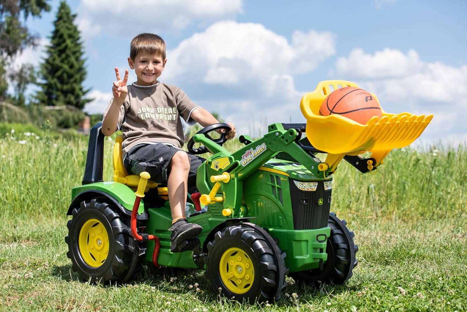 - Il RollyX-trac Premium John Deere 8400R è dotato di raccordi anteriori e posteriori e di una robusta asta dello sterzo per il fissaggio di vari accessori e fissaggi; ciò consente ai giovani avventurieri di personalizzare il proprio veicolo a proprio piacimento e di dare libero sfogo alla propria immaginazione