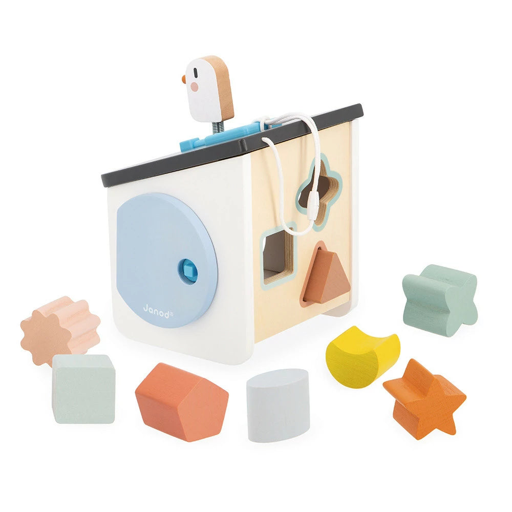 Benvenuto nella casetta degli uccellini! Questa scatola con forme in legno a forma di casetta per uccellini è adatta ai bambini dai 18 mesi in su. Inserendo i diversi pezzi al suo interno, il bambino svilupperà le abilità manuali e imparerà a riconoscere forme e colori. Questa scatola con forme da incastrare include 8 grandi pezzi in legno, le cui dimensioni sono progettate appositamente per la manipolazione. Per guidare il bambino e aiutarlo a procedere al proprio ritmo, le forme hanno lo stesso colore dei contorni sulla casetta, facilitando l'abbinamento. Questo giocattolo multisensoriale offre anche altre attività: basta guardare il simpatico uccellino appollaiato sul tetto! Fissato su una molla, susciterà la curiosità del bambino e lo inviterà a manipolarlo. Inoltre, il bambino può recuperare i pezzi caduti all'interno della scatola in 2 modi differenti: aprendo il tetto o la porta laterale usando la chiave riposta sulla parte superiore. Una scatola con forme da incastrare e una serratura da aprire? Una combinazione perfetta! L'altra caratteristica unica di questo giocattolo per la prima infanzia è il feltro che riveste il fondo della casetta, per attutire il rumore delle forme che cadono. Dolcezza è la parola chiave di questo giocattolo: legno naturale e feltro, colori intramontabili, un simpatico uccellino... È un giocattolo per bambini completo e resistente, che incoraggia la manipolazione e l'attività di incastro. Nascondere le forme all'interno della casetta per poi ritrovarle è una sorpresa che non smette di stupire i bambini! Questo giocattolo multisensoriale in legno fa parte della collezione Sweet Cocoon ed è fabbricato in legno certificato FSC™.