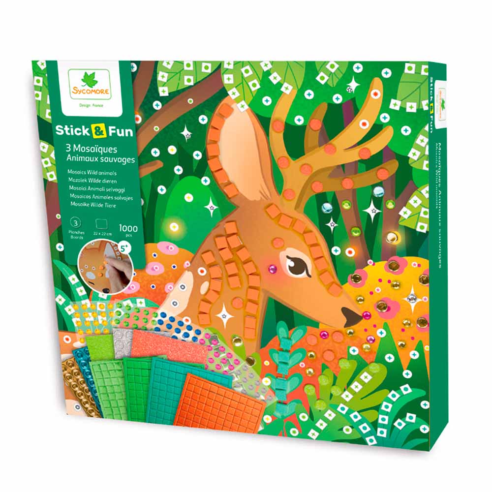 3 progetti da realizzare (22 x 22 cm), 950 tessere per mosaico (forme rotonde e quadrate), 50 gemme, 3 supporti per appendere, 1 foglio di istruzioni.