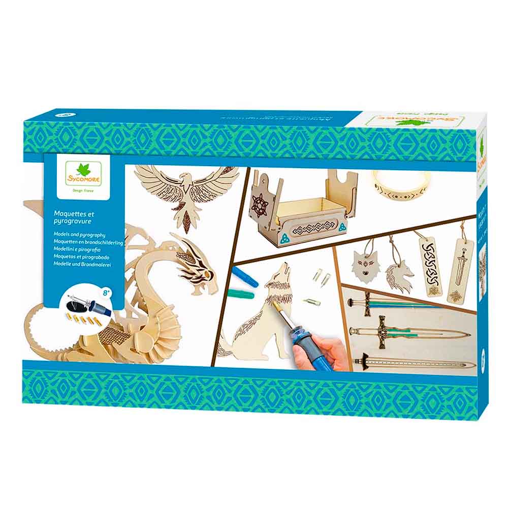 In questa scatola troverai un set completo di strumenti per la pirografia. Contiene: 1 strumento per pirografia con 5 punte intercambiabili, 1 modello di aquila, 1 scrigno del tesoro, 2 tavolette in legno con lupi e aquila da personalizzare, 1 tavoletta di prova, 1 bastoncino per creare un braccialetto in legno, pendenti e segnalibri, 2 pennarelli e istruzioni.