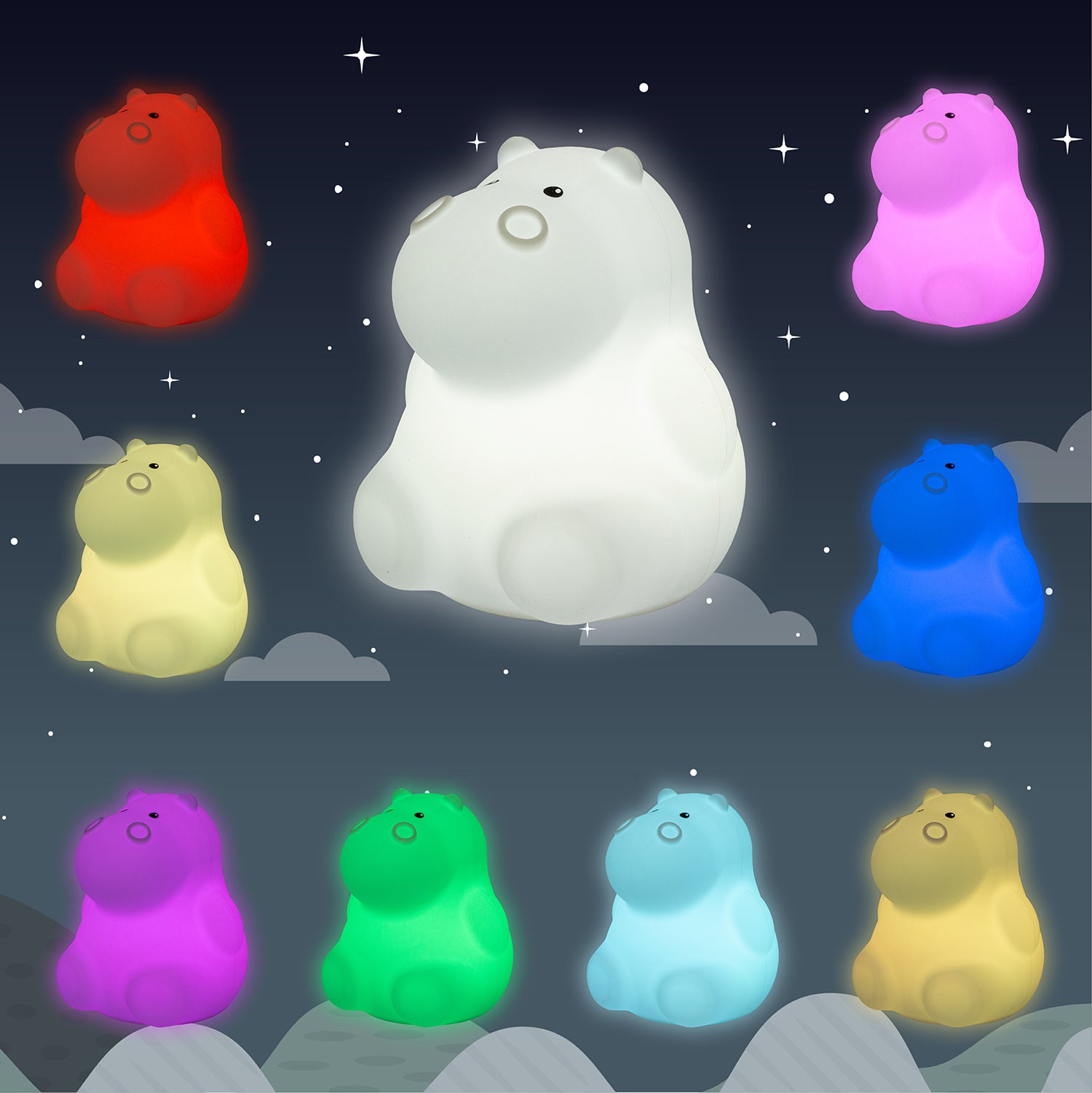 Il corpo della luce notturna è realizzato in morbido silicone di alta qualità, garantito senza ftalati, senza BPA e lavabile. La parte superiore è staccabile dalla base: la scatola luminosa. Questa è realizzata in plastica ABS, adatta a tutte le età. Le variazioni di luce sono ottenute in 3 modalità e 8 colori diversi. Il cambio di modalità avviene toccando la luce notturna o utilizzando il telecomando in dotazione. La luce notturna è alimentata a batteria. La ricarica avviene tramite il cavo USB in dotazione (tipo A <-> tipo µUSB), collegandolo a un dispositivo USB o a un caricabatterie universale (tipo caricabatterie per telefoni cellulari). Il telecomando (batteria inclusa) consente l'accesso a funzioni aggiuntive, ad esempio la funzione timer (15, 30 o 60 min).