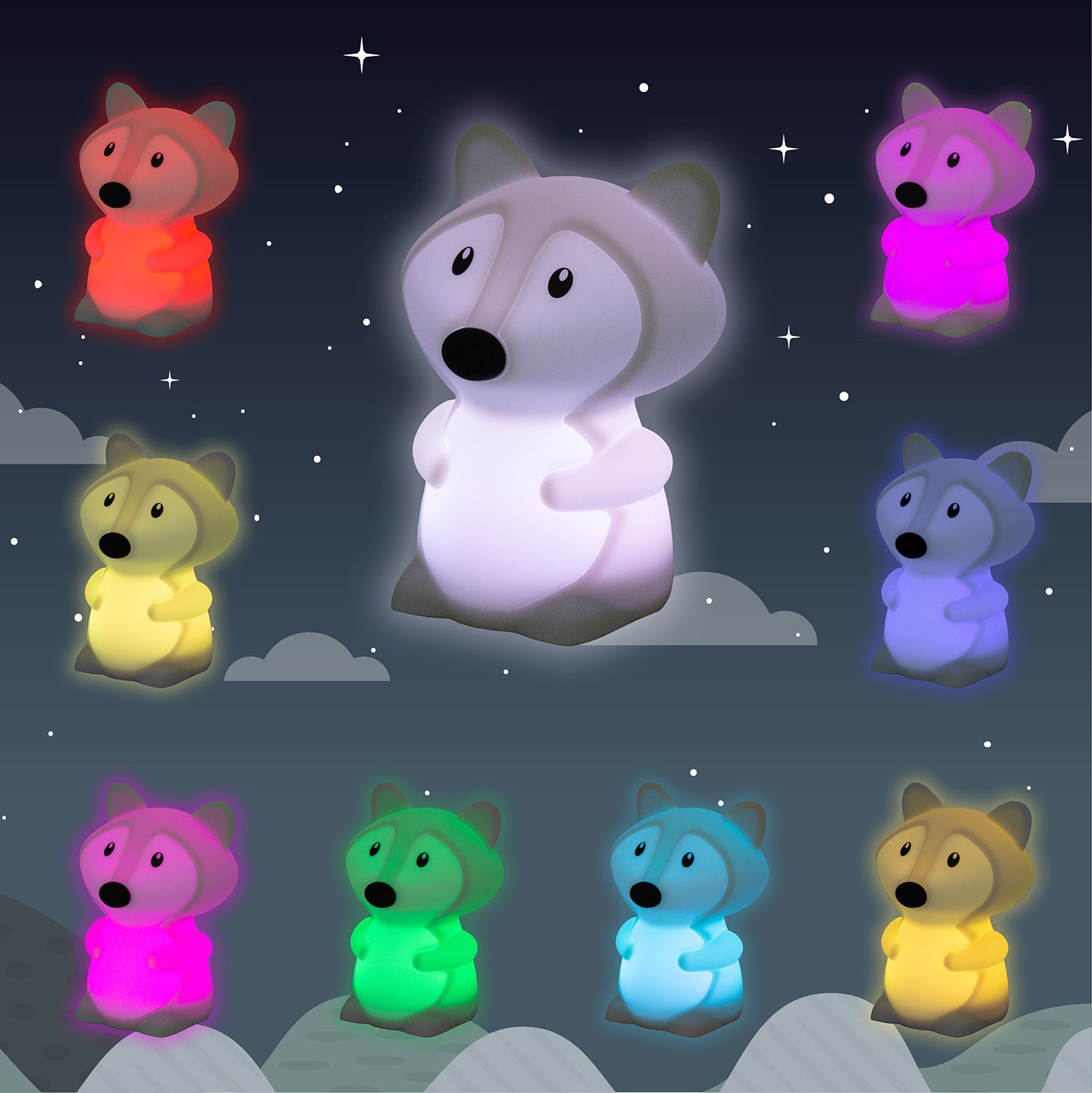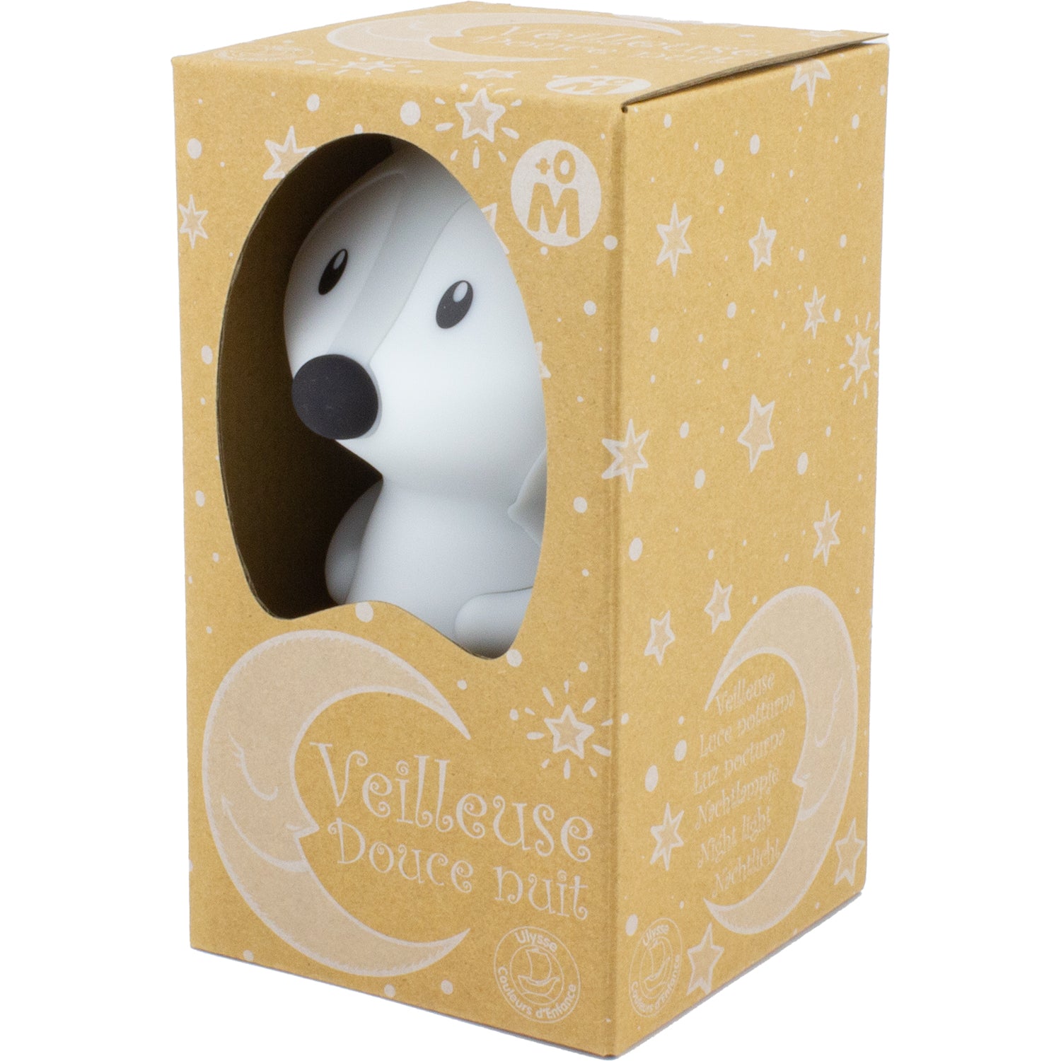 Il corpo della luce notturna è realizzato in silicone di alta qualità, garantito senza ftalati, senza BPA e lavabile. La parte superiore è staccabile dalla base: la scatola luminosa. Questa è realizzata in plastica ABS, adatta a tutte le età. Le variazioni di luce sono 3 e 8 colori diversi. Il cambio di modalità avviene toccando la luce notturna o utilizzando il telecomando in dotazione. La luce notturna è alimentata a batteria. Si ricarica tramite il cavo USB in dotazione (tipo A <-> tipo C), collegandolo a un dispositivo USB o a un caricabatterie universale (tipo caricabatterie per telefoni cellulari). Il telecomando (batteria inclusa) consente l'accesso a funzioni aggiuntive, ad esempio la funzione timer (15, 30 o 60 min).